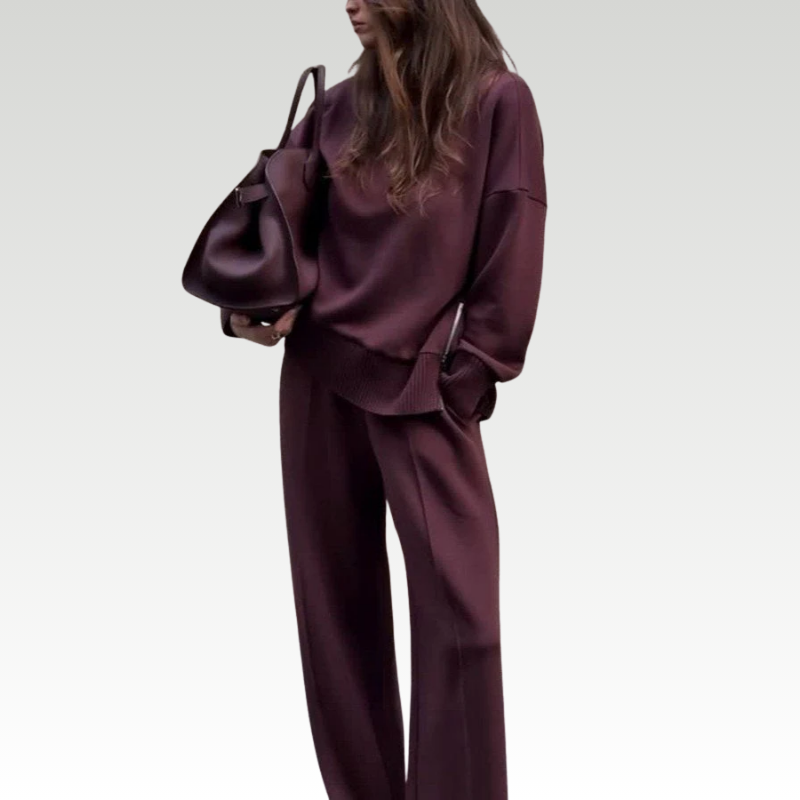 Ein Outfit für alle, die Komfort und Eleganz verbinden möchten. Der Rollkragenpullover mit seitlichem Reißverschluss sorgt für einen modernen und praktischen Touch, während die weite Hose mit elastischem Bund jederzeit Bewegungsfreiheit und Komfort bietet. Perfekt sowohl für einen lässigen Look als auch für elegantere Outfits.