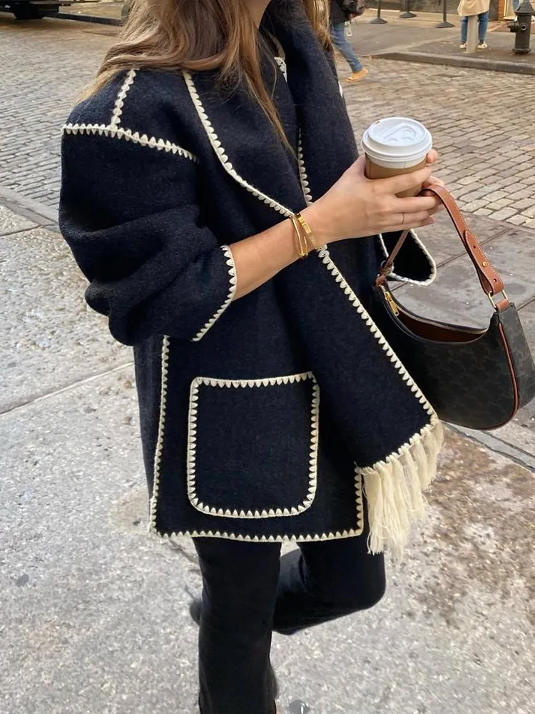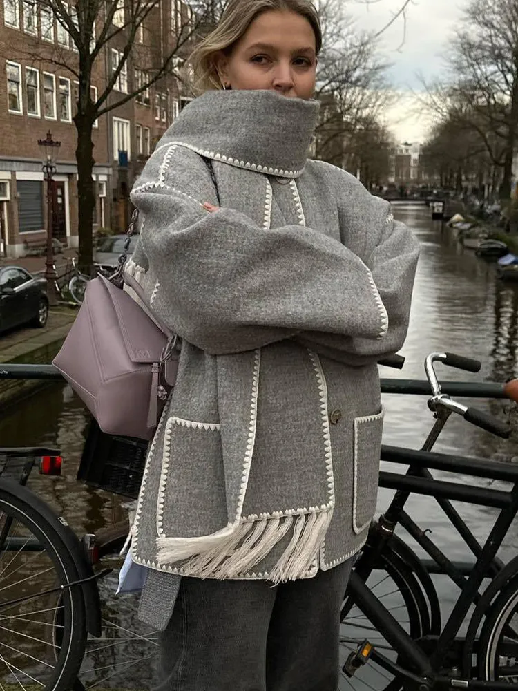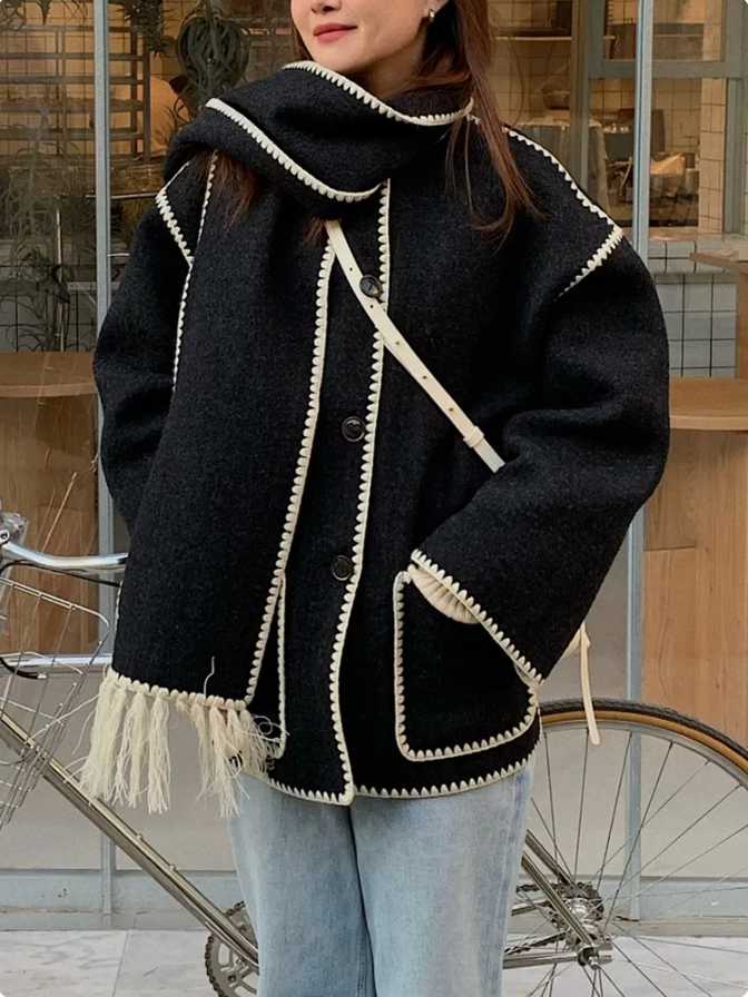 Die perfekte Herbstjacke, die man auch im Winter tragen kann. Die Jacke ist super bequem und hat einen Schal, der Sie schön warm hält.